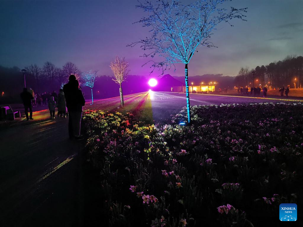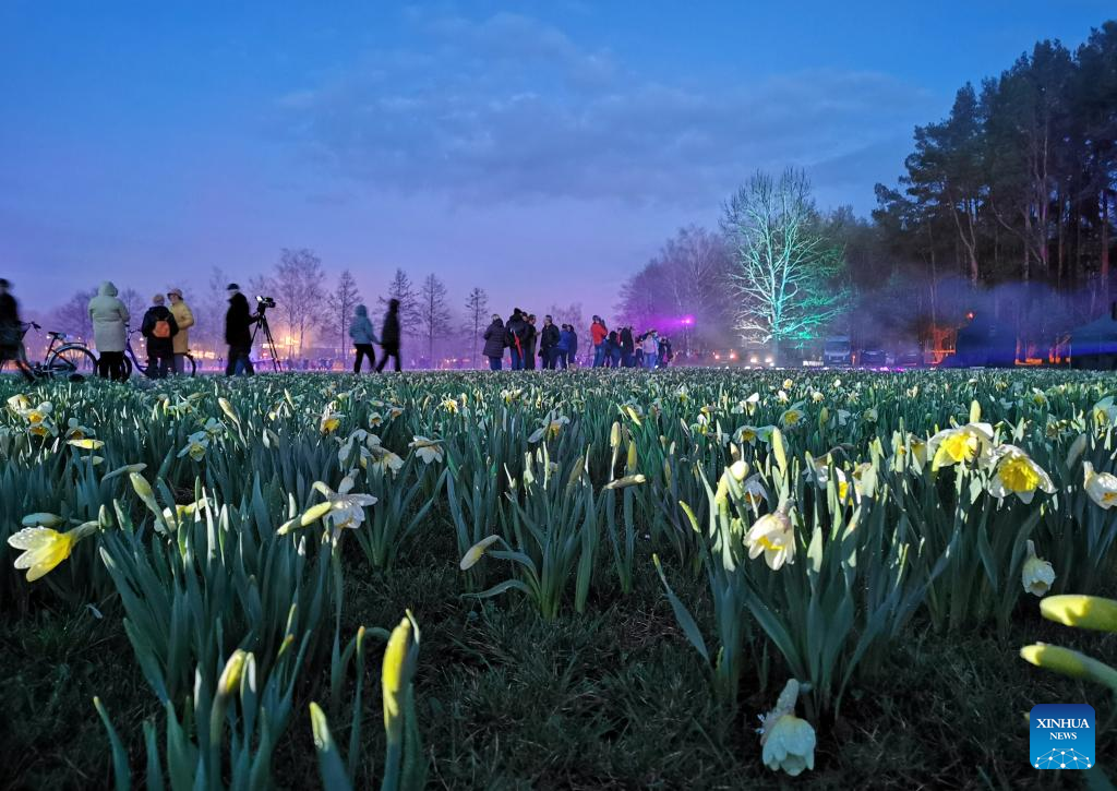 People visit the Festival of Daffodils in the evening in Druskininkai, Lithuania, April 23, 2022. From April 22 to 24, the Festival of Daffodils was held in Druskininkai, a spa town located in southern Lithuania. (Xinhua/Xue Dongmei)