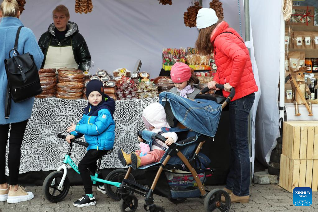 People visit the Festival of Daffodils in Druskininkai, Lithuania, April 22, 2022. From April 22 to 24, the Festival of Daffodils was held in Druskininkai, a spa town located in southern Lithuania. (Xinhua/Xue Dongmei)