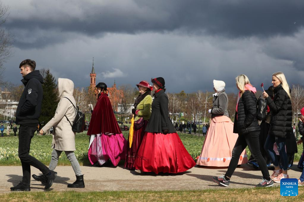 Artists perform at the Festival of Daffodils in Druskininkai, Lithuania, April 23, 2022. From April 22 to 24, the Festival of Daffodils was held in Druskininkai, a spa town located in southern Lithuania. (Xinhua/Xue Dongmei)
