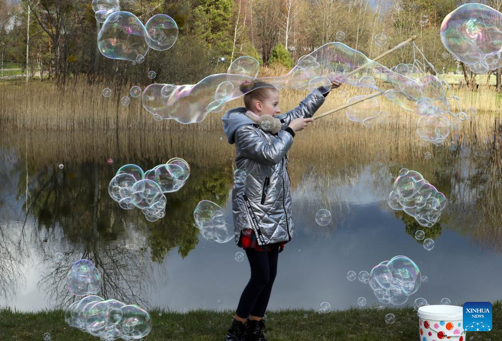 A child plays bubbles at the Festival of Daffodils in Druskininkai, Lithuania, April 23, 2022. From April 22 to 24, the Festival of Daffodils was held in Druskininkai, a spa town located in southern Lithuania. (Xinhua/Xue Dongmei)