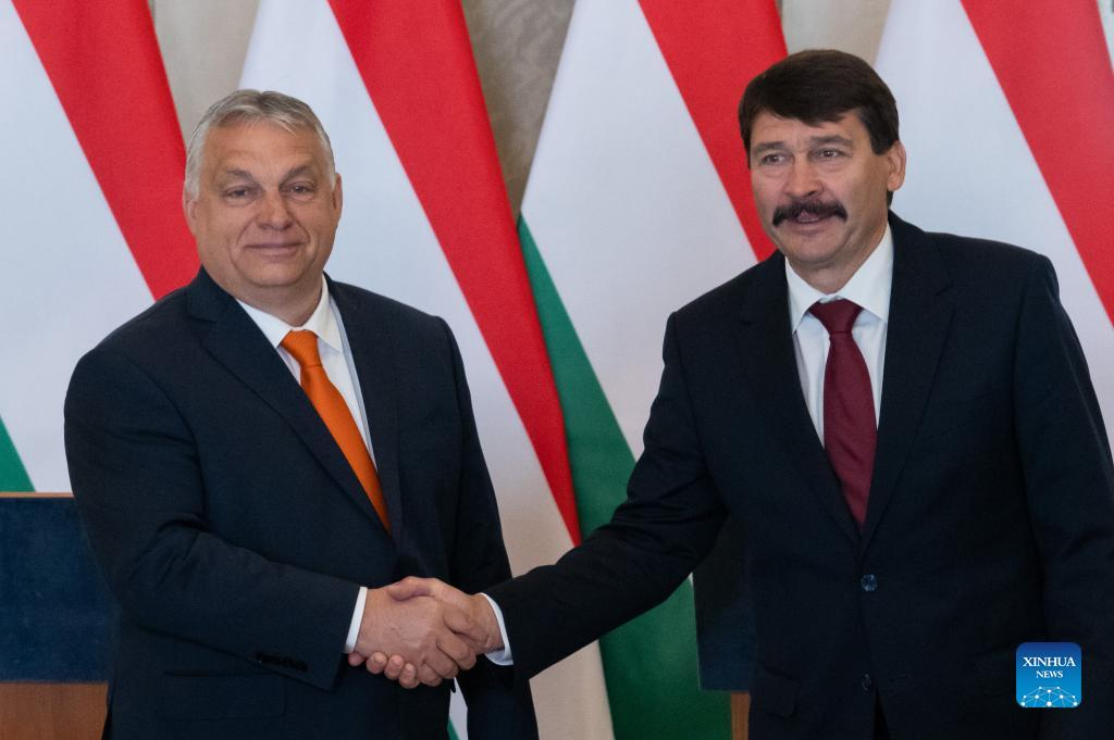 Hungarian President Janos Ader (R) and Prime Minister Viktor Orban shake hands at a press conference in Budapest, Hungary, April 29, 2022. Hungarian President Janos Ader has asked Viktor Orban, the prime ministerial candidate of the Fidesz-KDNP coalition that won the parliamentary election on April 3, to form a new government. Orban accepted Ader's invitation here on Friday morning. Ader and Orban made a short joint press declaration after their meeting in the Sandor Palace. (Photo by Attila Volgyi/Xinhua)