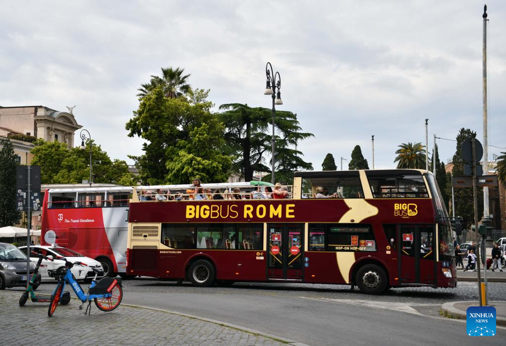 Tourists take a sightseeing bus in Rome, Italy, May 1, 2022. Starting from May 1, people in Italy are no longer required to show green passes when entering bars, restaurants, health centers, gyms, night clubs and other places, while still obligated to wear face masks on public transport and in some indoor venues until at least June 15. (Xinhua/Jin Mamengni)