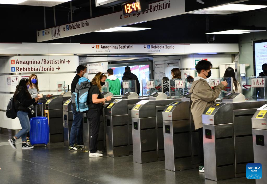 People walk through the ticket barrier at a metro station in Rome, Italy, May 1, 2022. Starting from May 1, people in Italy are no longer required to show green passes when entering bars, restaurants, health centers, gyms, night clubs and other places, while still obligated to wear face masks on public transport and in some indoor venues until at least June 15. (Xinhua/Jin Mamengni)