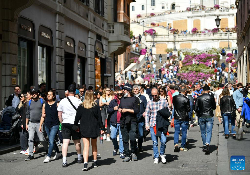 People walk on Via dei Condotti in Rome, Italy, May 1, 2022. Starting from May 1, people in Italy are no longer required to show green passes when entering bars, restaurants, health centers, gyms, night clubs and other places, while still obligated to wear face masks on public transport and in some indoor venues until at least June 15. (Xinhua/Jin Mamengni)