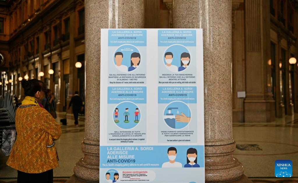 A COVID-19 notice board is seen in Galleria Alberto Sordi in Rome, Italy, May 1, 2022. Starting from May 1, people in Italy are no longer required to show green passes when entering bars, restaurants, health centers, gyms, night clubs and other places, while still obligated to wear face masks on public transport and in some indoor venues until at least June 15. (Xinhua/Jin Mamengni)