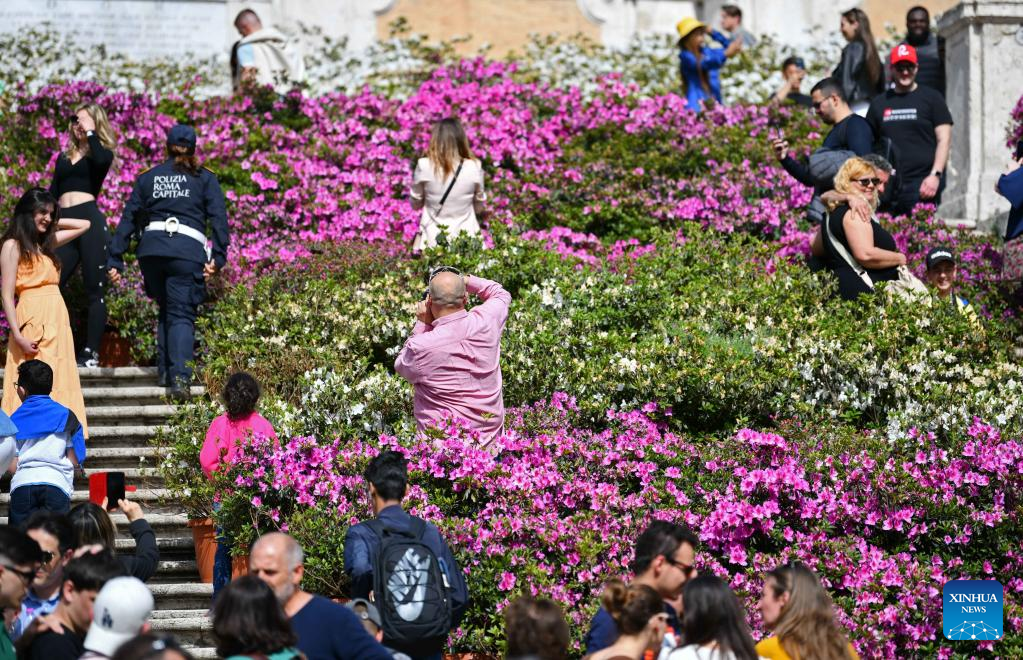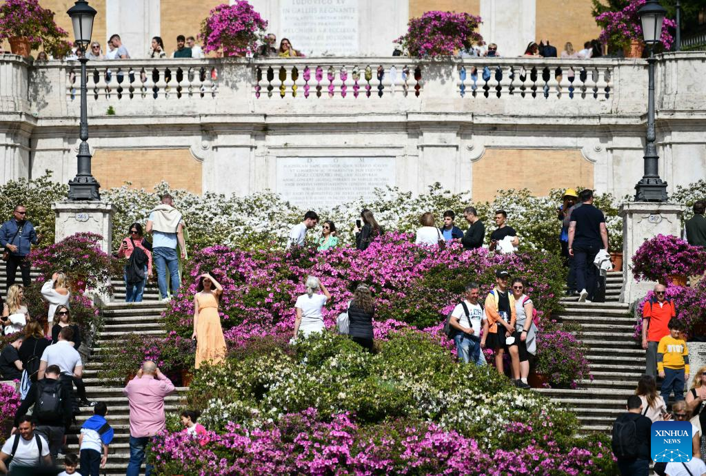 Tourists take photos at Spanish Steps in Rome, Italy, May 1, 2022. Starting from May 1, people in Italy are no longer required to show green passes when entering bars, restaurants, health centers, gyms, night clubs and other places, while still obligated to wear face masks on public transport and in some indoor venues until at least June 15. (Xinhua/Jin Mamengni)