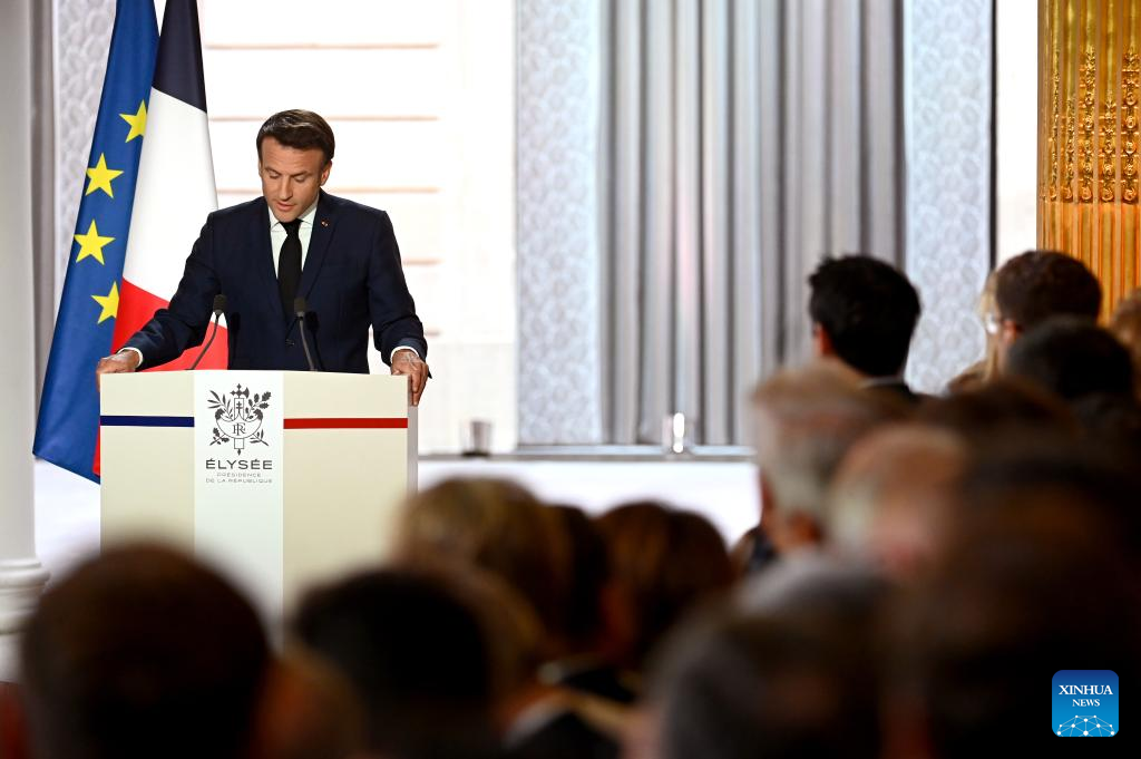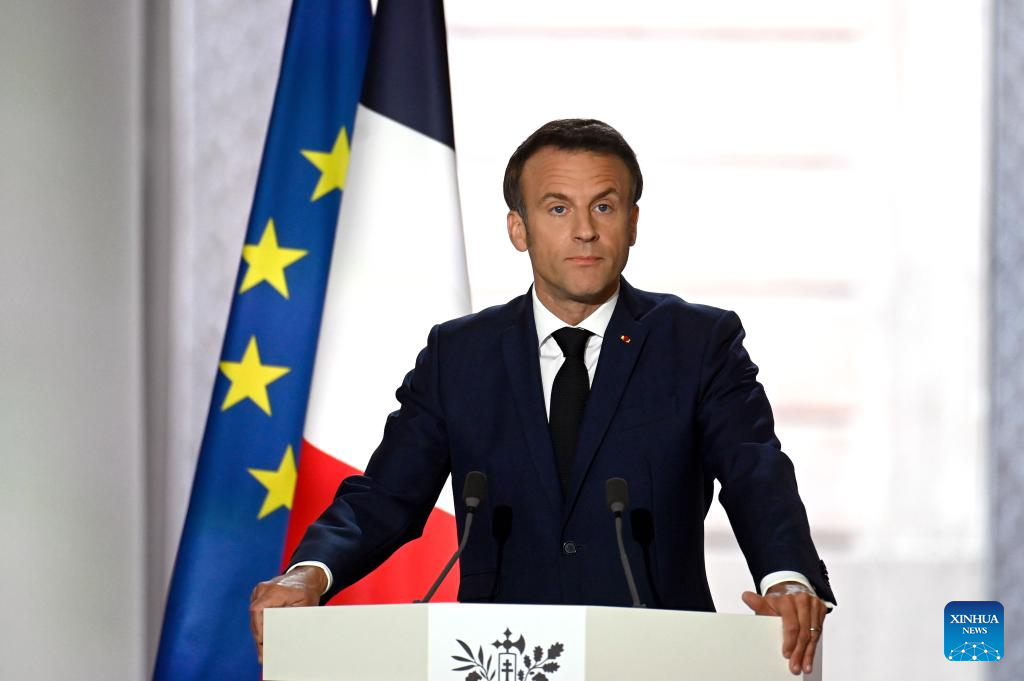 France's President Emmanuel Macron addresses the investiture ceremony at the Elysee Palace, in Paris, France, May 7, 2022. (Xinhua)