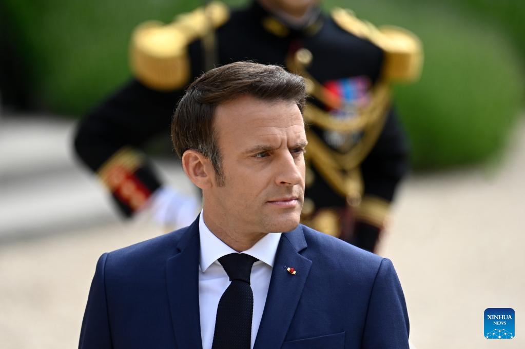 French President Emmanuel Macron reviews the troops in the gardens of the Elysee Palace after the investiture ceremony in Paris, France, May 7, 2022. (Xinhua)