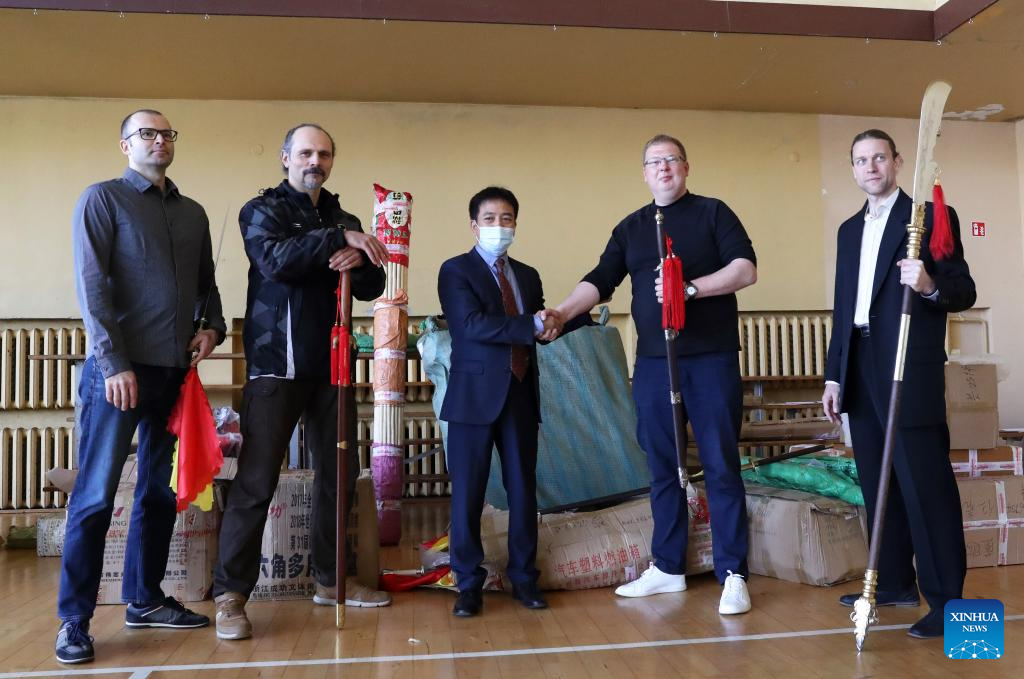 China's Charge d'affaires Qu Baihua (C) donates assorted wushu equipment to the organizer Lithuanian Wushu Federation at the Vilnius Open Wushu Cup in Vilnius, Lithuania, on May 7, 2022. The Vilnius Open Wushu Cup opened on Saturday, drawing more than 50 students from local wushu clubs. (Xinhua/Xue Dongmei)