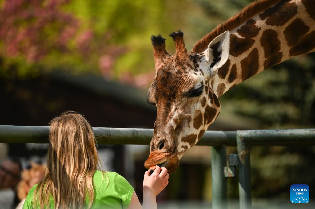 A woman feeds a giraffe at the newly-built pavilion of Orientarium in the Zoo Lodz, Poland, on May 5, 2022. (Photo by Alexey Vitvitsky/Xinhua)
