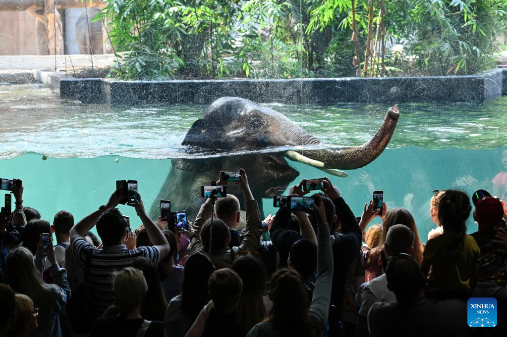 Elephant Taru swims at the newly-built pavilion of Orientarium in the Zoo Lodz, Poland, on May 5, 2022. (Photo by Alexey Vitvitsky/Xinhua)