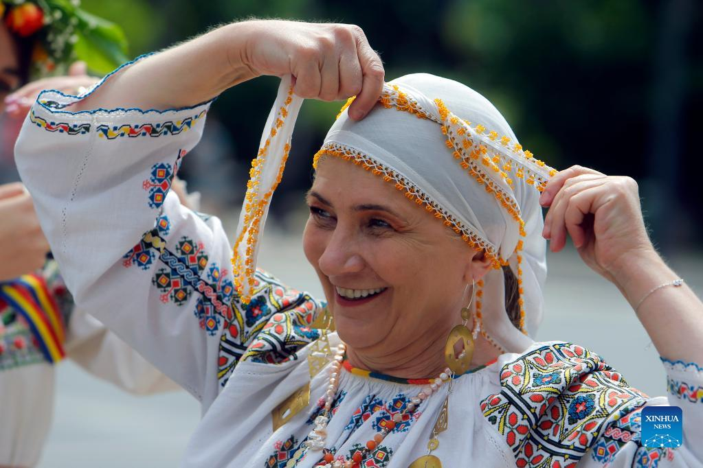 Women attend an event showcasing Romania's traditional costume in Bucharest, Romania, May 8, 2022. (Photo by Gabriel Petrescu/Xinhua)