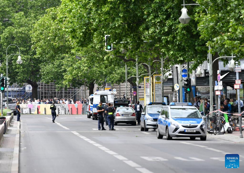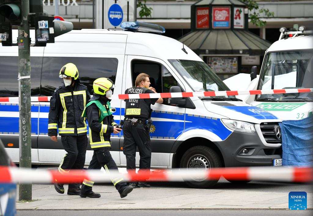 Police officers work at the scene after a vehicle crashed into a crowd in Berlin, Germany, June 8, 2022. A vehicle crashed into a crowd of people in Berlin's Charlottenburg locality, leaving one person killed and more than a dozen injured, German news agency dpa reported on Wednesday. (Xinhua/Ren Pengfei)