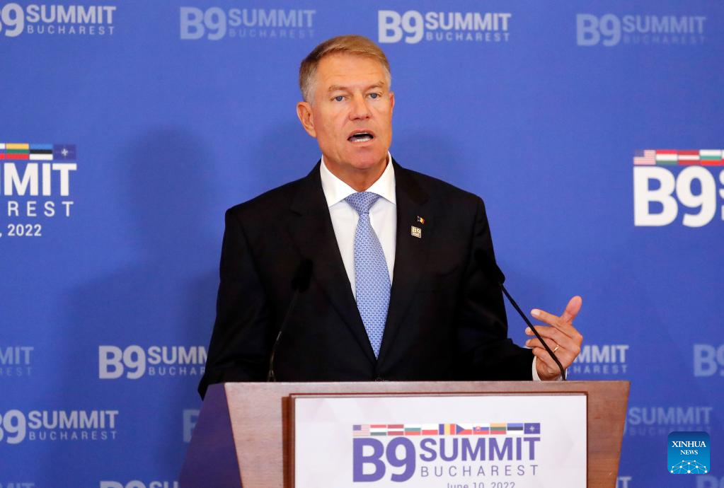 Romanian President Klaus Iohannis attends a news conference at the end of Bucharest 9 Summit in Bucharest, Romania, on June 10, 2022. Bucharest 9 (B9) Summit participants want a consolidated NATO presence on the eastern flank, Romanian President Klaus Iohannis said on Friday. (Photo by Cristian Cristel/Xinhua)
