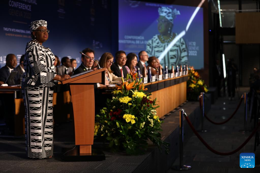 Director-General of the World Trade Organization (WTO) Ngozi Okonjo-Iweala (at the podium) addresses the opening ceremony of the WTO's 12th Ministerial Conference in Geneva, Switzerland, on June 12, 2022. The WTO's 12th Ministerial Conference (MC12) opened Sunday at WTO headquarters in Geneva. (WTO/Handout via Xinhua)