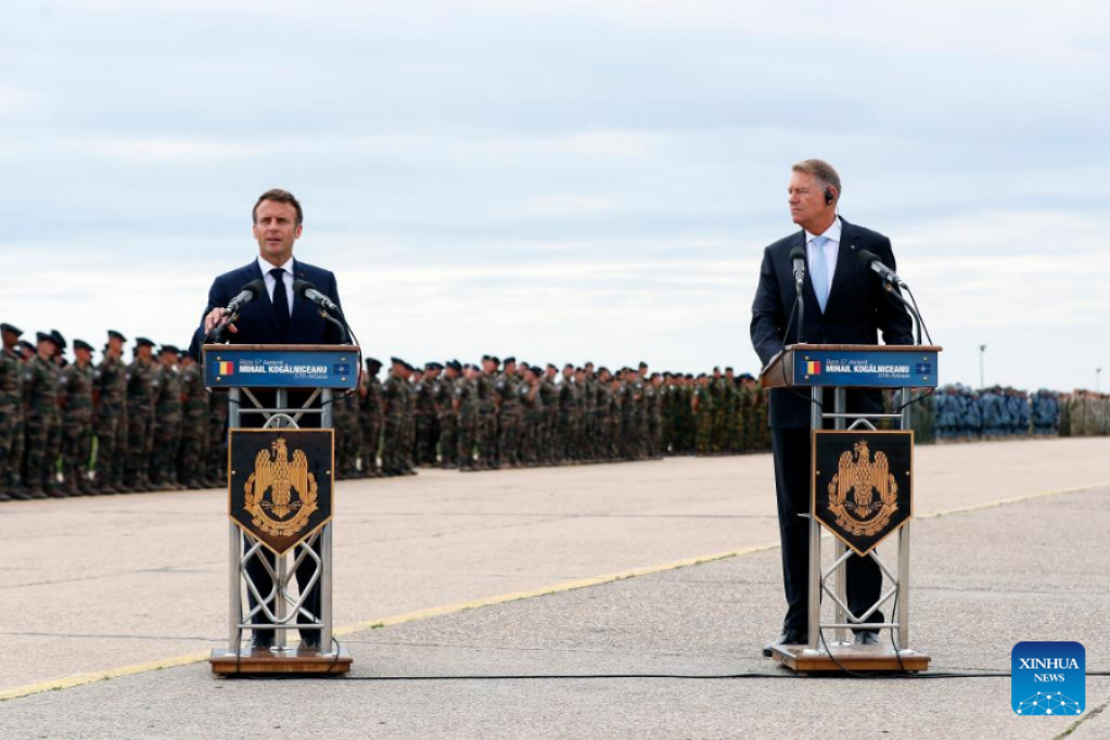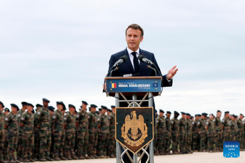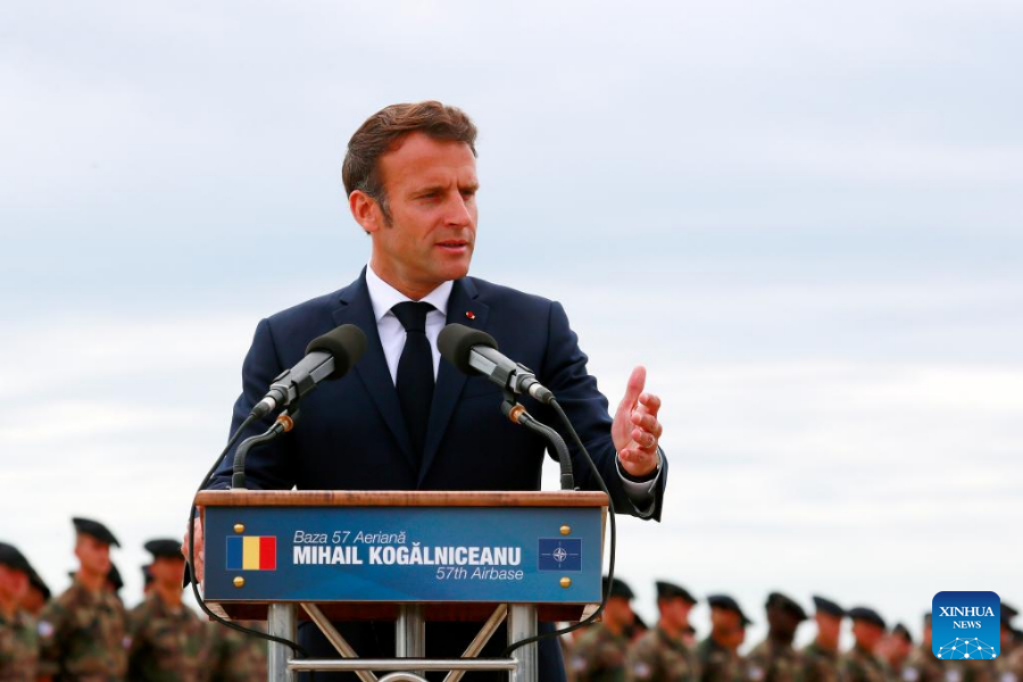 French President Emmanuel Macron addresses a joint press conference with Romanian President Klaus Iohannis (not in photo) at the Mihail Kogalniceanu Air Base near Constanta, Romania, June 15, 2022. (Photo by Cristian Cristel/Xinhua)
