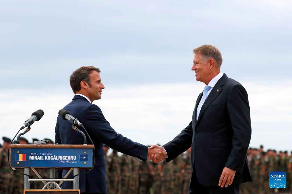French President Emmanuel Macron (L) shakes hand with Romanian President Klaus Iohannis at the Mihail Kogalniceanu Air Base near Constanta, Romania, June 15, 2022. (Photo by Cristian Cristel/Xinhua)