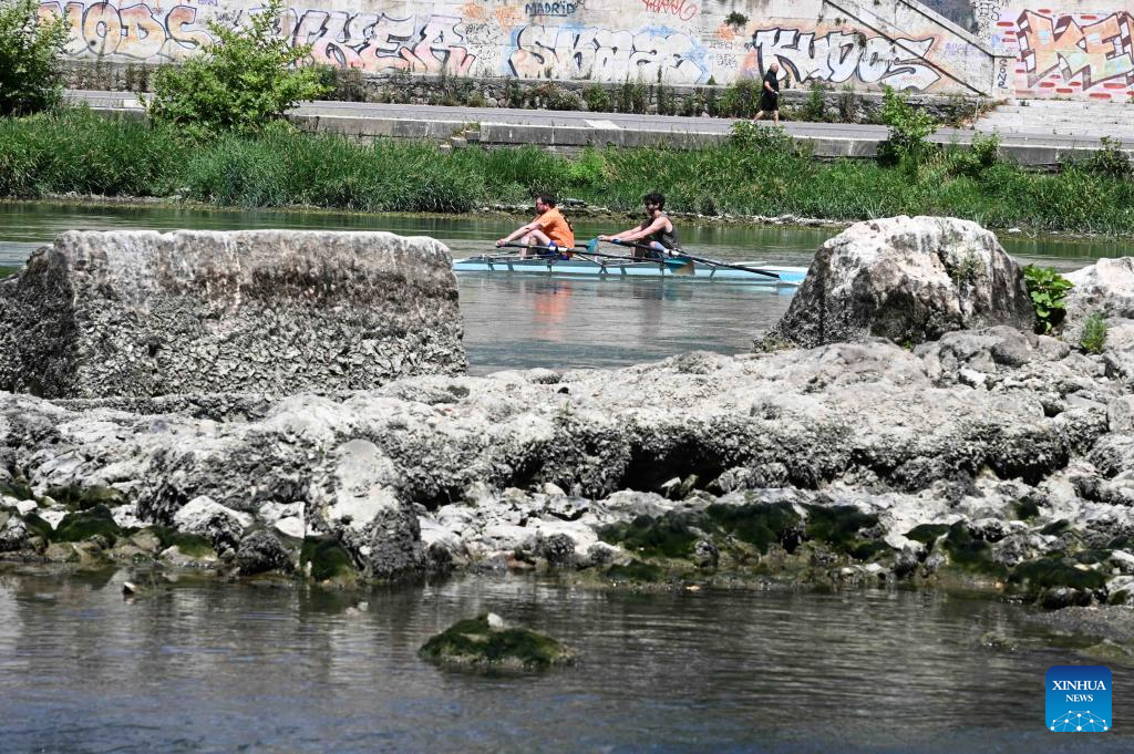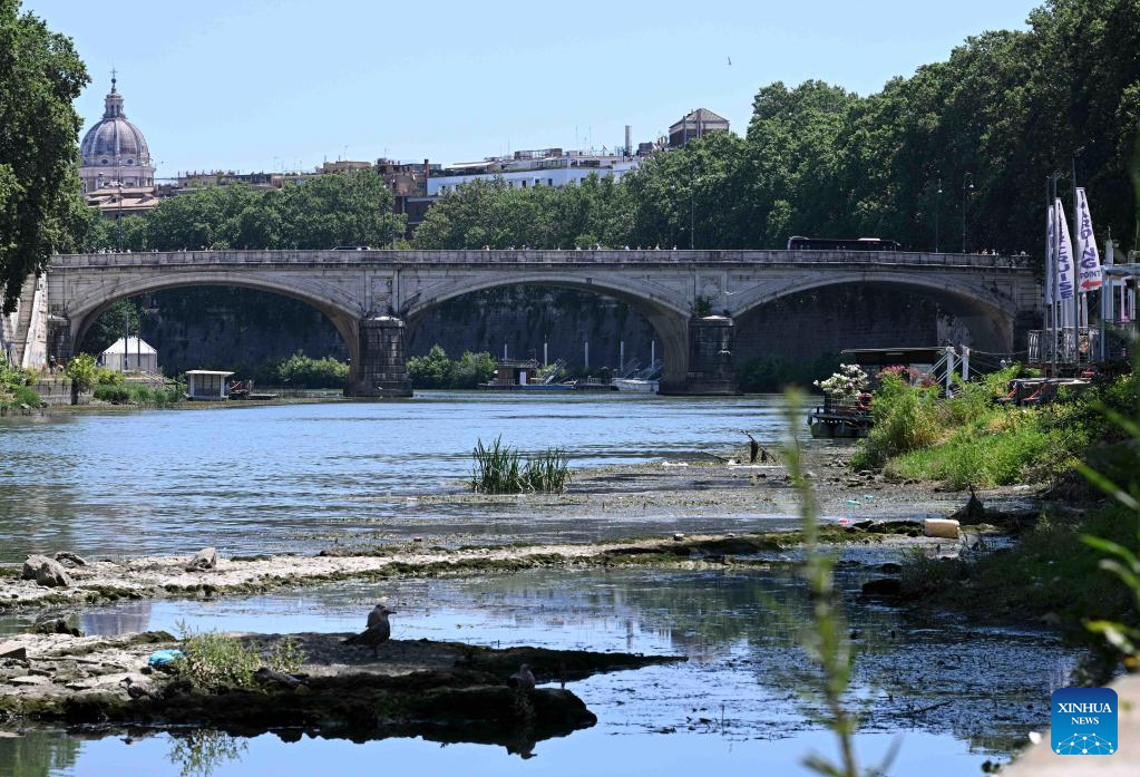 The Tiber River is seen with low water level in Rome, Italy, on June 19, 2022. A heatwave swept across Italy this week, sparking emergencies in at least four cities and putting half of the agricultural production in the north at drought risk. (Photo by Alberto Lingria/Xinhua)