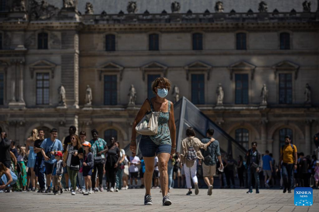 A woman wearing a face mask walks in front of the Louvre Museum in Paris, France, July 8, 2022. The total number of COVID-19 related deaths in France passed the 150,000 mark on Friday, after 74 deaths related to the virus were recorded in hospitals in the past 24 hours, announced the country's public health agency. (Photo by Aurelien Morissard/Xinhua)