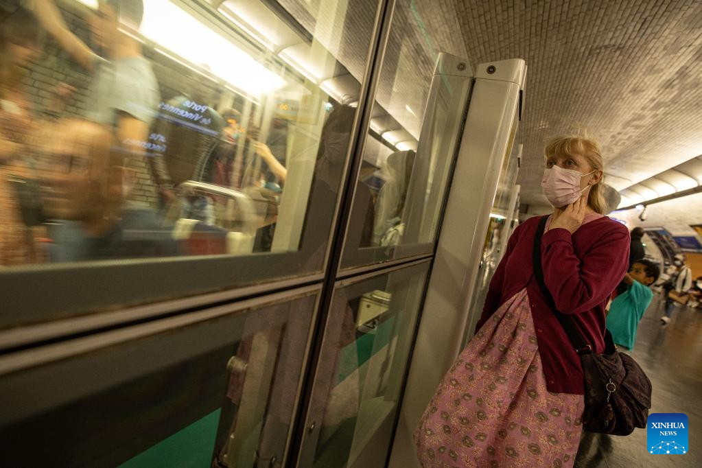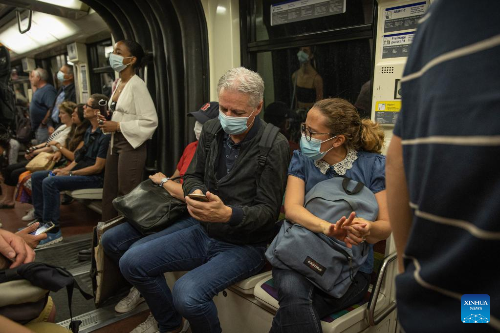 People wearing masks take subway in Paris, France, July 8, 2022. The total number of COVID-19 related deaths in France passed the 150,000 mark on Friday, after 74 deaths related to the virus were recorded in hospitals in the past 24 hours, announced the country's public health agency. (Photo by Aurelien Morissard/Xinhua)