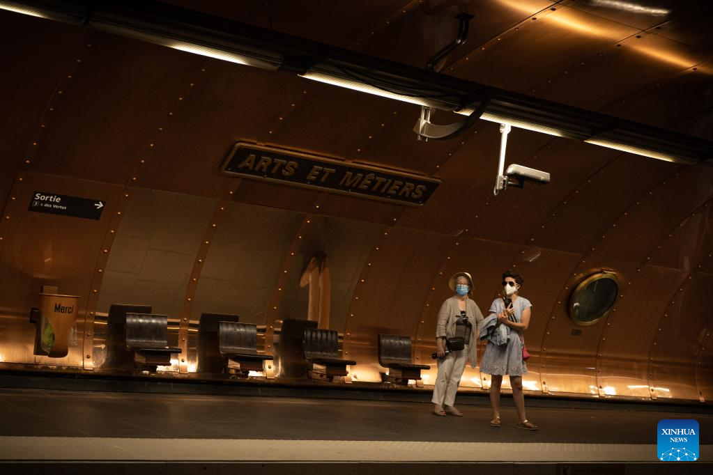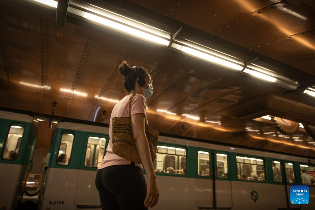 People wearing masks wait at a subway station in Paris, France, July 8, 2022. The total number of COVID-19 related deaths in France passed the 150,000 mark on Friday, after 74 deaths related to the virus were recorded in hospitals in the past 24 hours, announced the country's public health agency. (Photo by Aurelien Morissard/Xinhua)