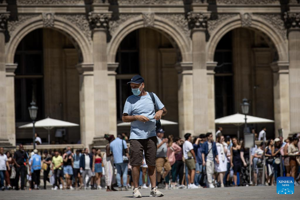 A man wearing a face mask walks in front of the Louvre Museum in Paris, France, July 8, 2022. The total number of COVID-19 related deaths in France passed the 150,000 mark on Friday, after 74 deaths related to the virus were recorded in hospitals in the past 24 hours, announced the country's public health agency. (Photo by Aurelien Morissard/Xinhua)