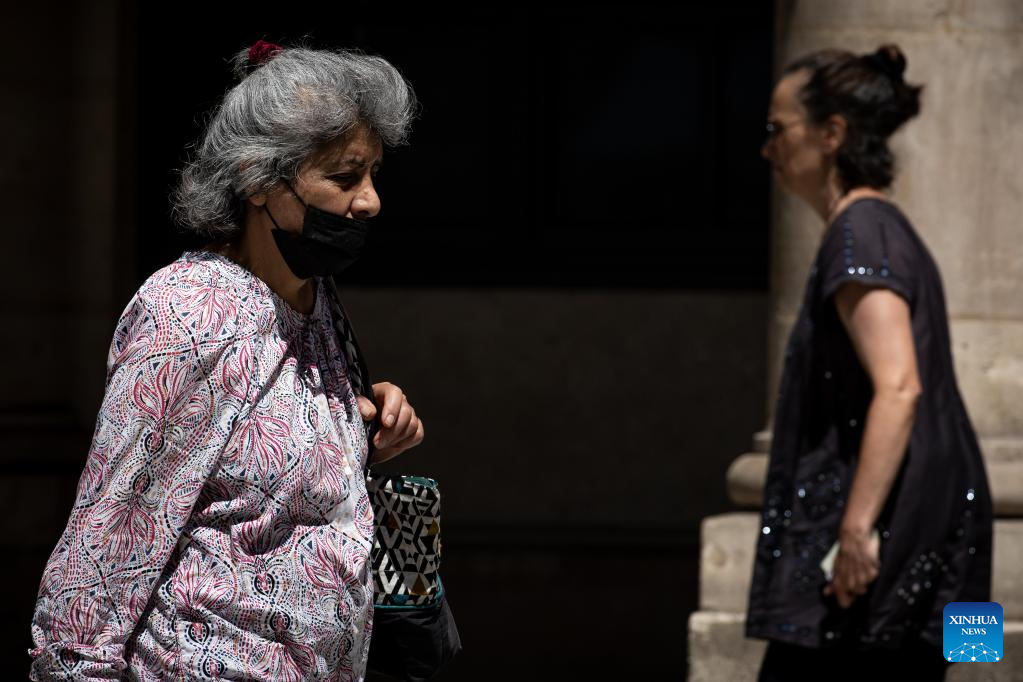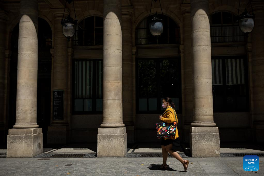 A woman wearing a face mask walks on a street in Paris, France, July 8, 2022. The total number of COVID-19 related deaths in France passed the 150,000 mark on Friday, after 74 deaths related to the virus were recorded in hospitals in the past 24 hours, announced the country's public health agency. (Photo by Aurelien Morissard/Xinhua)