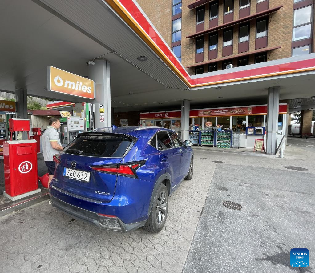A man fuels a vehicle at a gas station in Stockholm, Sweden, on July 14, 2022. (Xinhua/Fu Yiming)