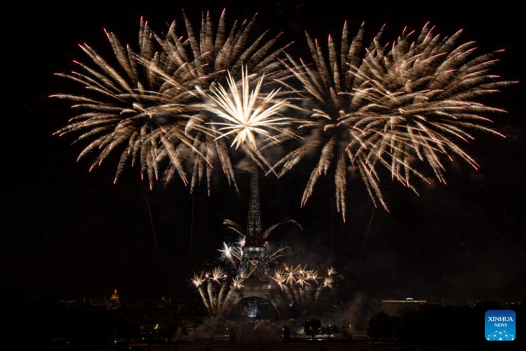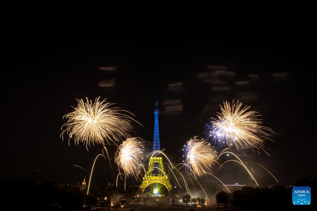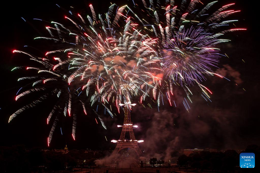 Fireworks explode near the Eiffel Tower during the Bastille Day celebrations in Paris, France, July 14, 2022. (Photo by Aurelien Morissard/Xinhua)