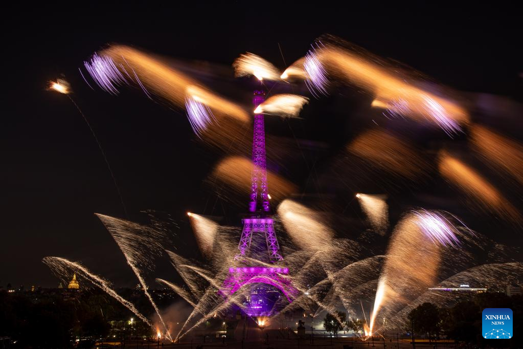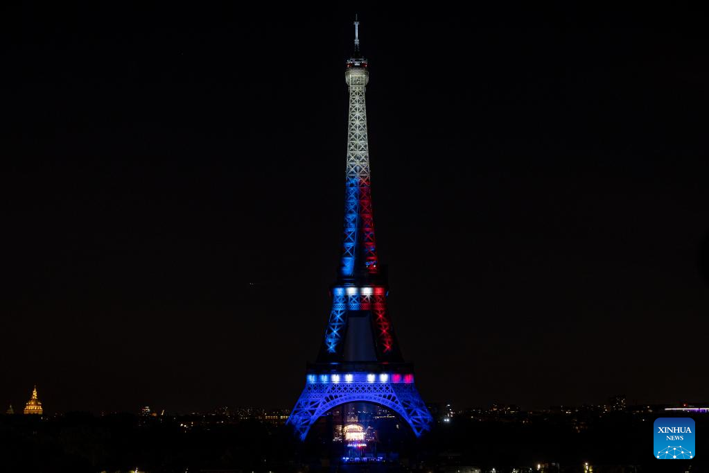 The Eiffel Tower is illuminated as part of the Bastille Day celebrations in Paris, France, July 14, 2022. (Photo by Aurelien Morissard/Xinhua)