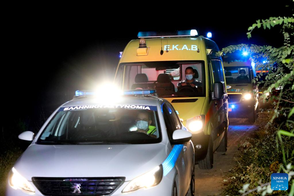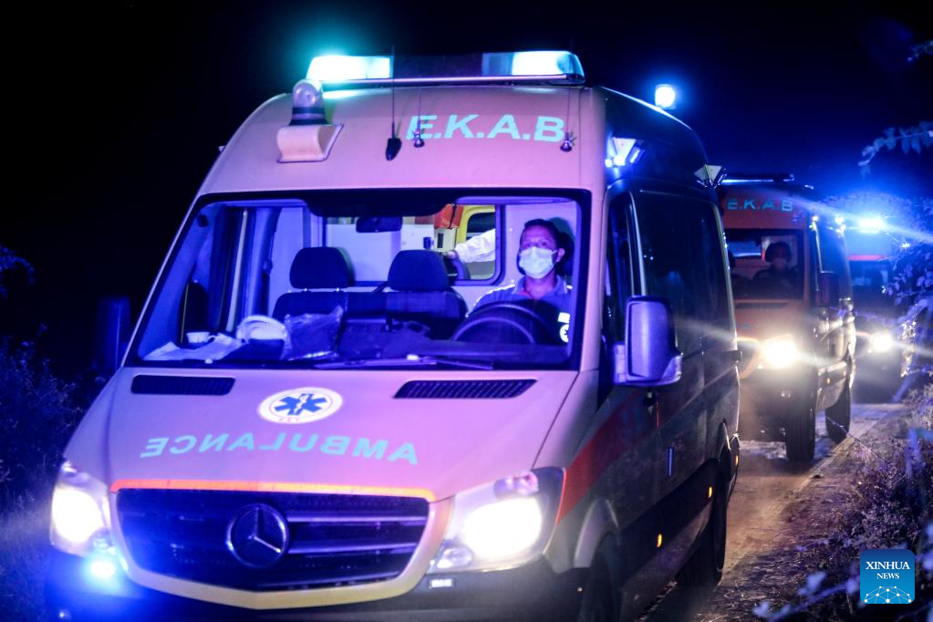 Ambulances head for the site where a Ukrainian cargo airplane crashed, near Kavala city in northern Greece, on July 17, 2022.