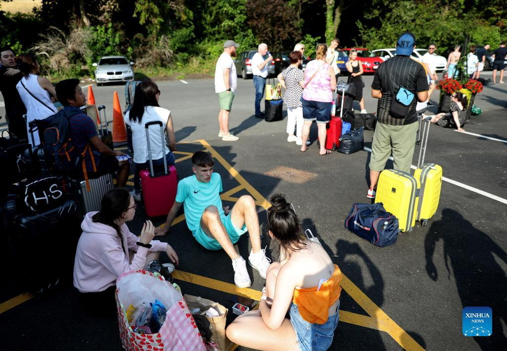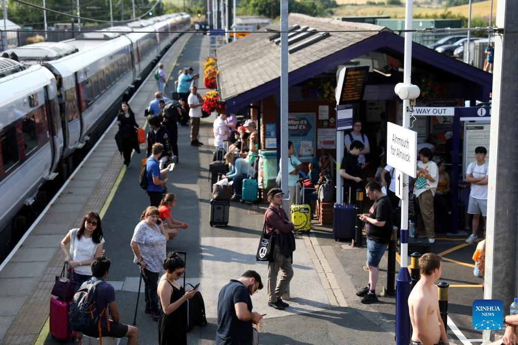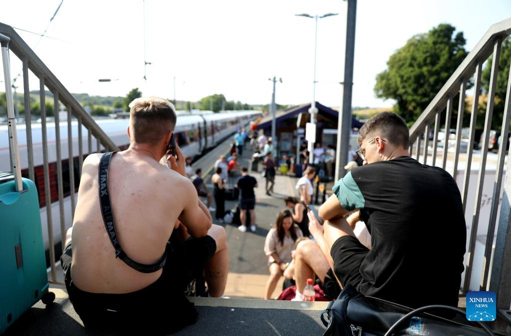 Travellers are stranded at Alnmouth station due to railroad failure amid high temperature in Alnmouth, Britain, July 18, 2022. The United Kingdom had its hottest day on record on Tuesday with temperatures exceeding 40 degrees Celsius in some places. The sweltering heat put the country's transport and medical services to a severe test. (Xinhua/Li Ying)