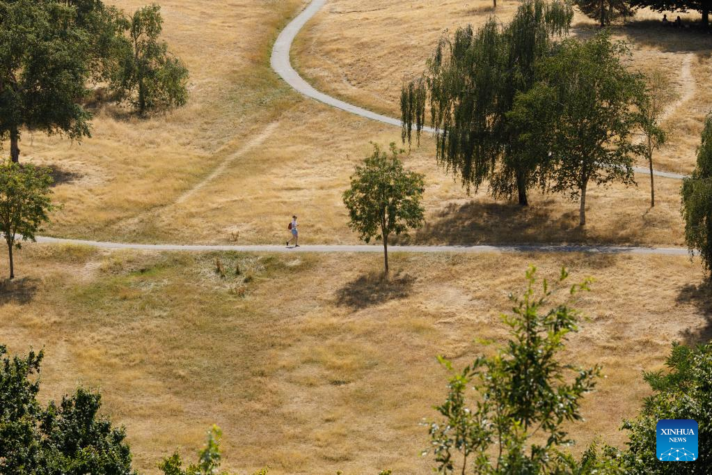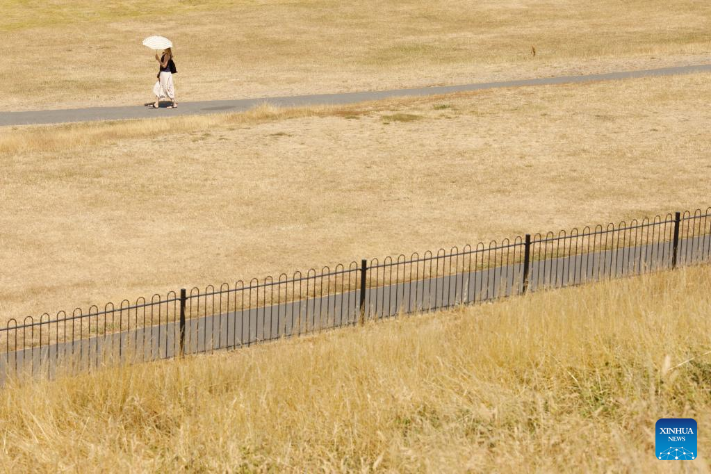 A woman walks in Greenwich Park in London, Britain, July 18, 2022. Much of the United Kingdom (UK) was gripped by scorching weather on Monday, with no respite from the sweltering heat forecast before the middle of this week. The authorities have warned of travel disruptions and suggested people work from home in the coming days. (Photo by Tim Ireland/Xinhua)