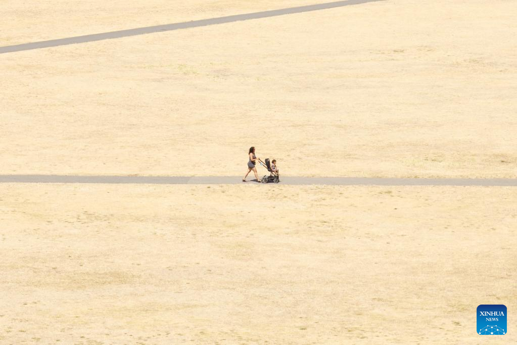 A woman walks with a trolley in Greenwich Park in London, Britain, July 18, 2022. Much of the United Kingdom (UK) was gripped by scorching weather on Monday, with no respite from the sweltering heat forecast before the middle of this week. The authorities have warned of travel disruptions and suggested people work from home in the coming days. (Photo by Tim Ireland/Xinhua)