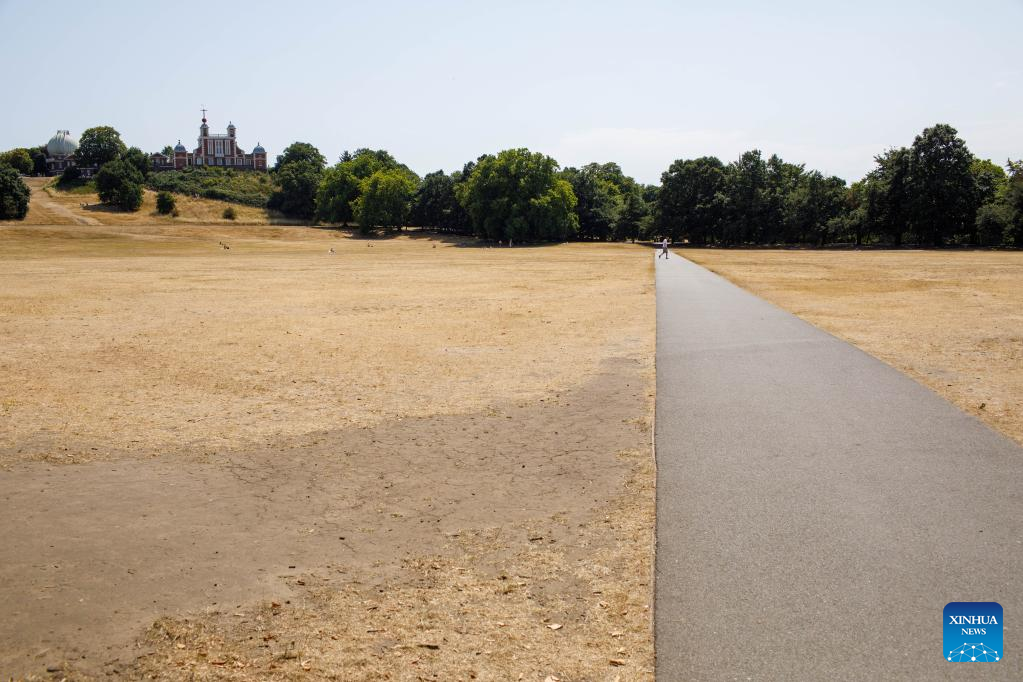 Photo taken on July 18, 2022 shows a view of Greenwich Park in London, Britain. Much of the United Kingdom (UK) was gripped by scorching weather on Monday, with no respite from the sweltering heat forecast before the middle of this week. The authorities have warned of travel disruptions and suggested people work from home in the coming days. (Photo by Tim Ireland/Xinhua)