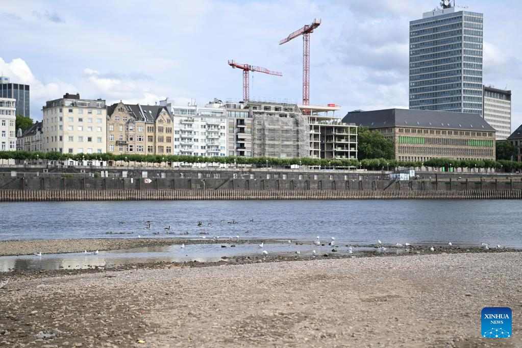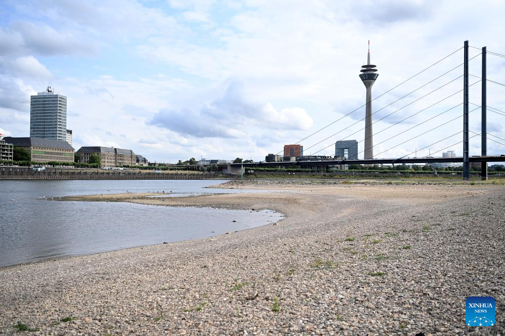 Photo taken on July 26, 2022 shows River Rhine in Dusseldorf, Germany. The water level of River Rhine has dropped due to high temperature and drought. (Photo by Ulrich Hufnagel/Xinhua)