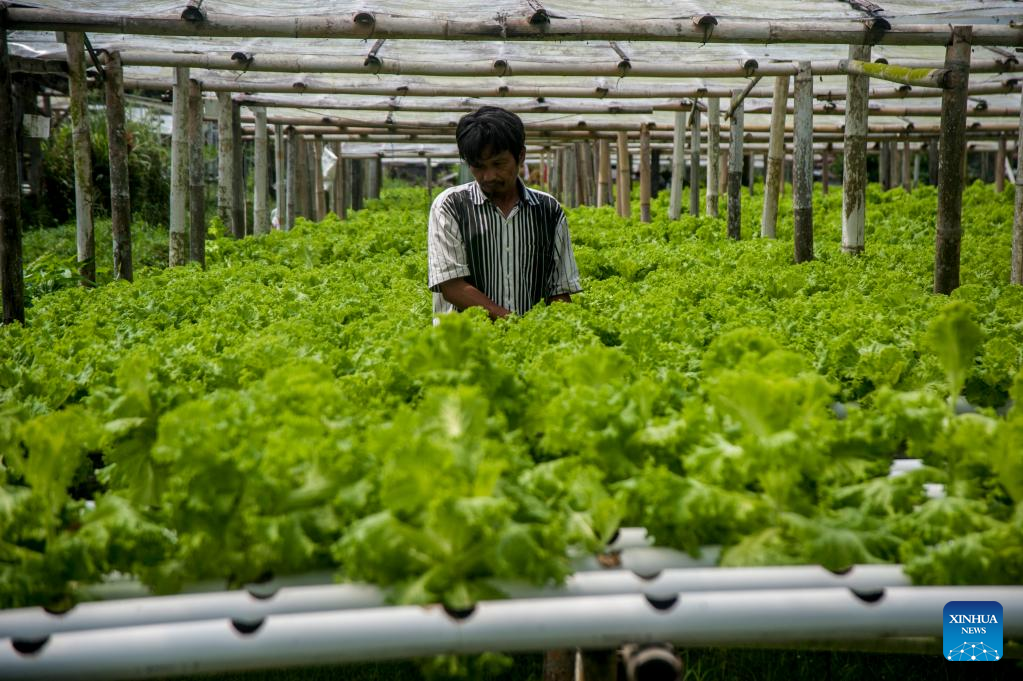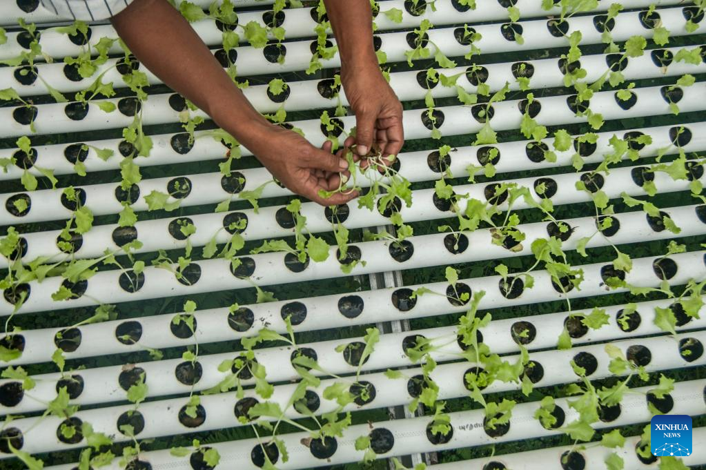 A worker checks lettuce grown at a vegetables hydroponic farm at Kaliurang, Sleman district, Yogyakarta, Indonesia, Aug. 12, 2022. Hydroponic farming is the practice of growing plants in nutrient solutions without the use of soil. (Photo by Agung Supriyanto/Xinhua)