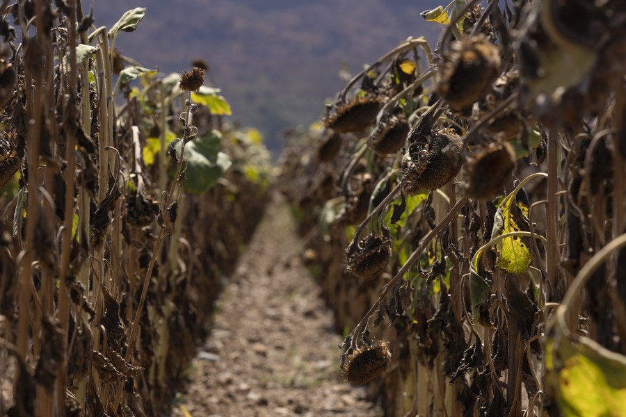 Withered sunflowers are seen in Karst, Nova Gorica, Slovenia, Aug. 16, 2022. (Photo by Zeljko Stevanic/Xinhua)