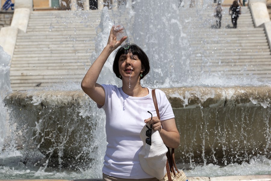 A woman pours water on her head during a heatwave in Athens, Greece, on June 22, 2022. (Xinhua/Marios Lolos)