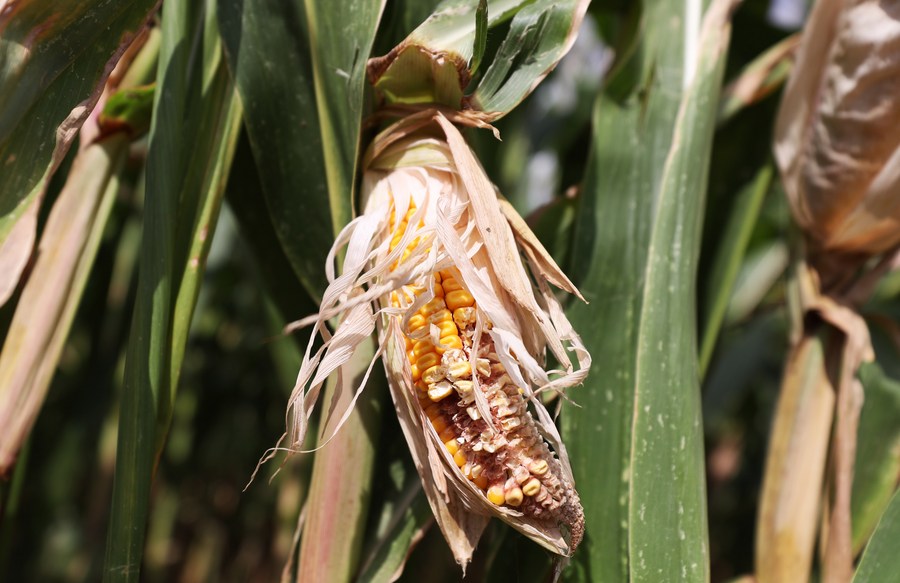 A dried corn field is seen as a severe drought hits France, in Puiseux-Pontoise, about 30 km northwest of Paris, France, Aug. 18, 2022. (Xinhua/Gao Jing)