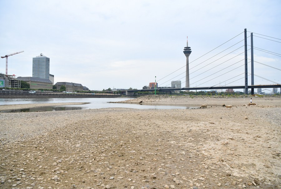 Photo taken on Aug. 17, 2022 shows the bank of River Rhine in Dusseldorf, Germany. The water level of River Rhine has dropped due to high temperature and drought. (Xinhua/Ren Pengfei)