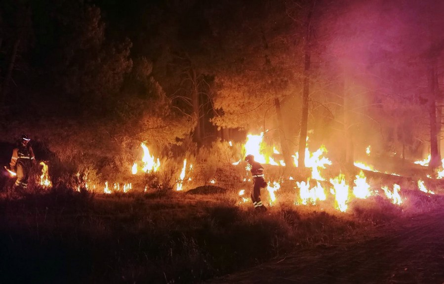Firefighters battle a wildfire in Cebreros, Castilla y Leon, Spain, July 21, 2022. (Junta de Castilla y Leon/Handout via Xinhua)