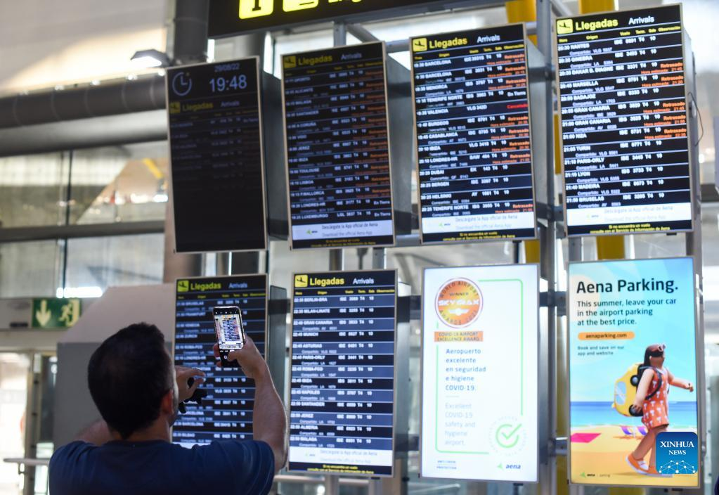 A man takes photos of flight information at Adolfo-Suarez-Barajas Airport in Madrid, Spain, Aug. 29, 2022. At least seven flights had to be diverted from Madrid's Adolfo-Suarez-Barajas Airport on Monday due to the presence of drones in the area. Monday was another difficult day for air travelers in Spain, due to strikes by the cabin crew of low-cost airlines Ryanair and Iberia Express, and the pilots of EasyJet. The ongoing actions calling for better working conditions (in the case of Ryanair and Iberia Express) and a return to pre-pandemic conditions (Easyjet pilots), led to the cancellation of 14 flights (10 from Madrid) on Monday. A further 28 were delayed. (Photo by Gustavo Valiente/Xinhua)