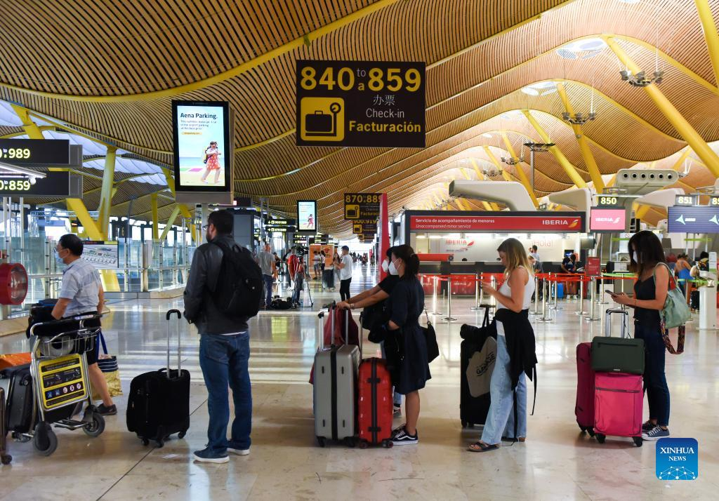 Passengers wait for departure at Adolfo-Suarez-Barajas Airport in Madrid, Spain, Aug. 29, 2022. At least seven flights had to be diverted from Madrid's Adolfo-Suarez-Barajas Airport on Monday due to the presence of drones in the area. Monday was another difficult day for air travelers in Spain, due to strikes by the cabin crew of low-cost airlines Ryanair and Iberia Express, and the pilots of EasyJet. The ongoing actions calling for better working conditions (in the case of Ryanair and Iberia Express) and a return to pre-pandemic conditions (Easyjet pilots), led to the cancellation of 14 flights (10 from Madrid) on Monday. A further 28 were delayed. (Photo by Gustavo Valiente/Xinhua)