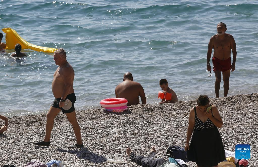 Elder people enjoy themselves at a beach in Antalya, Türkiye, Aug. 28, 2022. Türkiye's southern coastal province of Antalya, well known for its golden beaches, is trying to attract more elderly European tourists running away from rising living costs. (Photo by Mustafa Kaya/Xinhua)