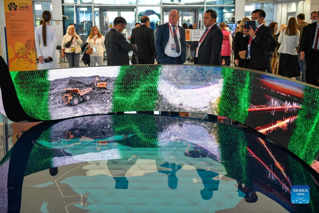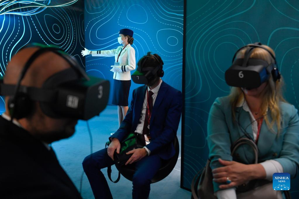 People interact with VR presentation during the 7th Eastern Economic Forum (EEF) in Vladivostok, Russia, Sept. 5, 2022. The 7th EEF kicked off in Russia's far eastern city of Vladivostok on Monday. (Photo by Alexander Zemlianichenko Jr/Xinhua)