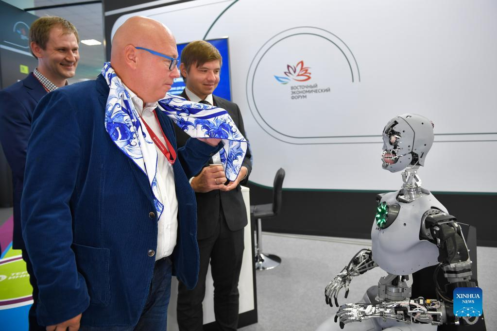 People interact with a talking robot during the 7th Eastern Economic Forum (EEF) in Vladivostok, Russia, Sept. 5, 2022. The 7th EEF kicked off in Russia's far eastern city of Vladivostok on Monday. (Photo by Alexander Zemlianichenko Jr/Xinhua)