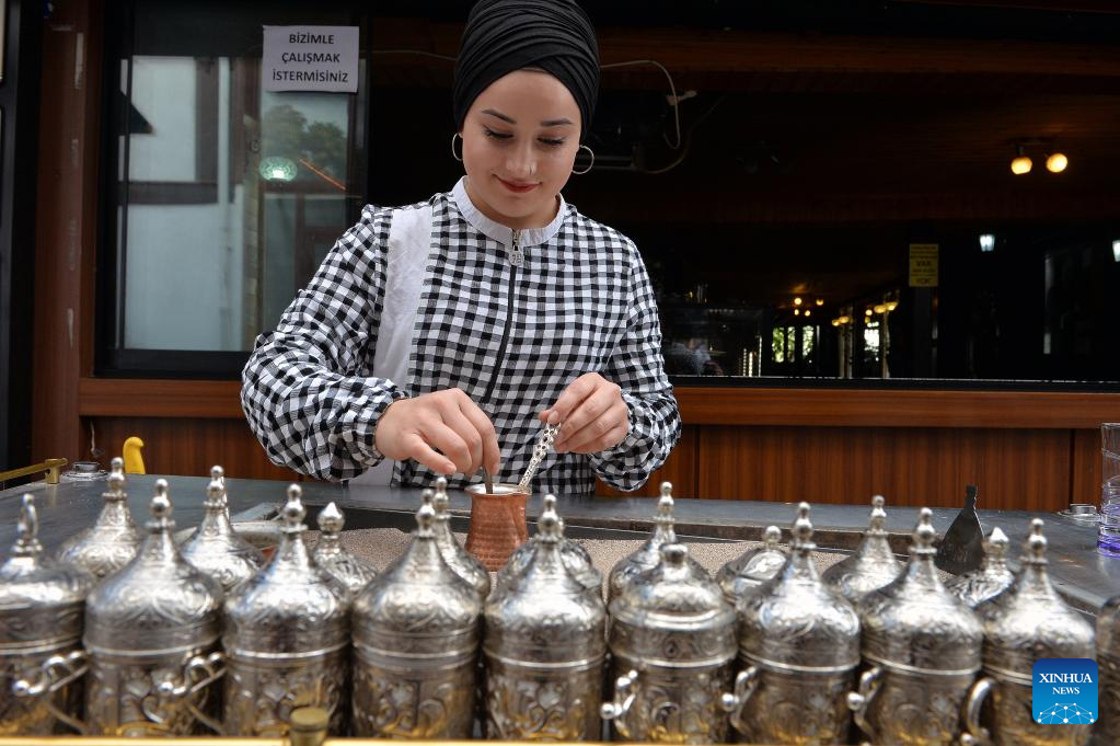 An employee prepares Turkish coffee for customers in Ankara, Türkiye, Sept. 6, 2022. (Photo by Mustafa Kaya/Xinhua)