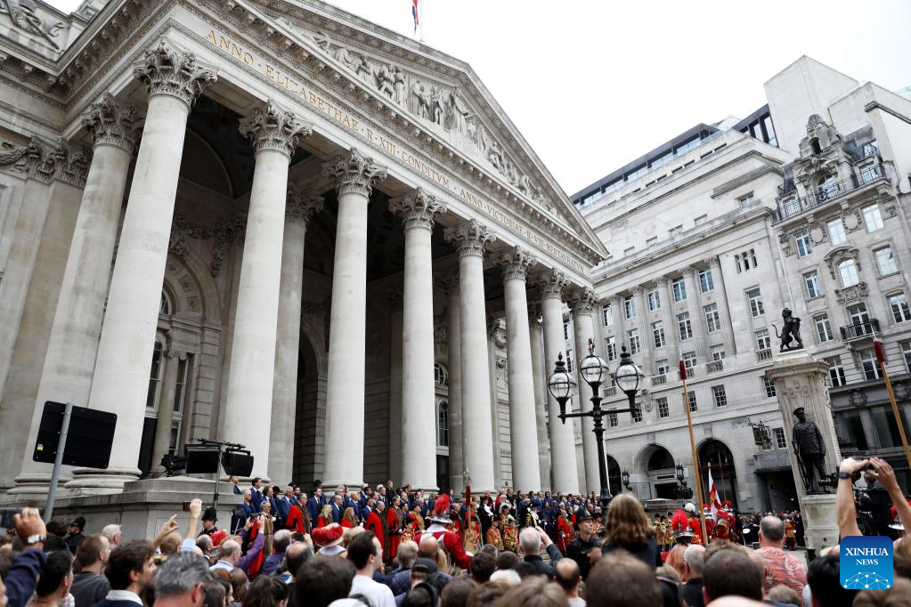 The Accession Proclamation for King Charles III is read during a ceremony held at the Royal Exchange in the City of London, Britain, Sept. 10, 2022. King Charles III was formally proclaimed Britain's new monarch at a meeting of the Accession Council at St James's Palace on Saturday. (Xinhua/Li Ying)