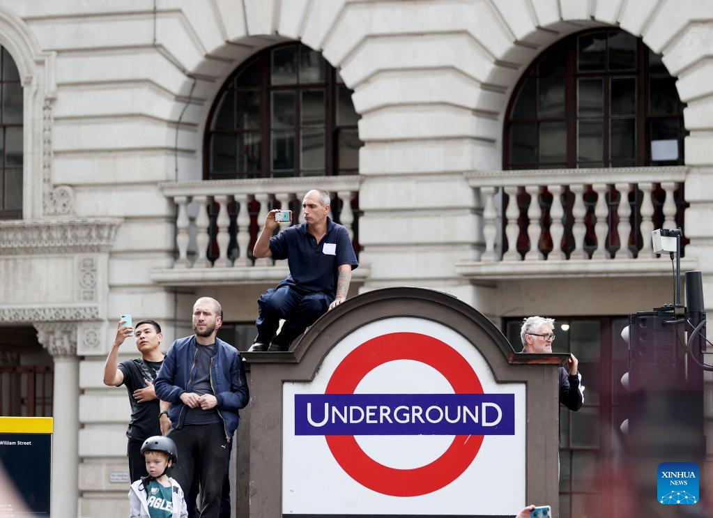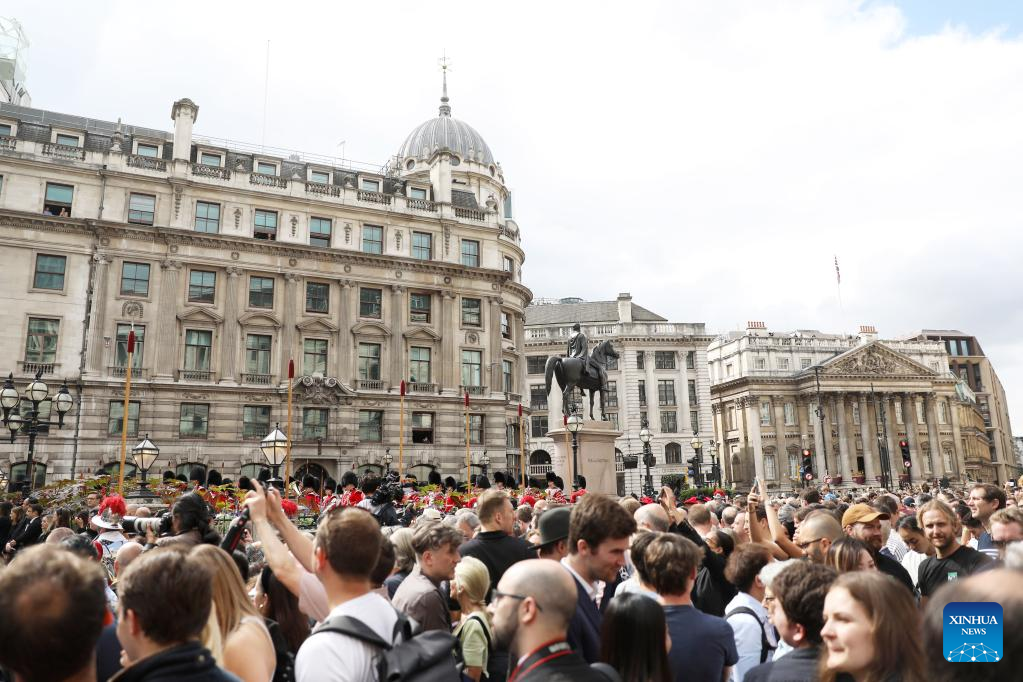 People watch a ceremony where the Accession Proclamation for King Charles III is read at the Royal Exchange in the City of London, Britain, Sept. 10, 2022. King Charles III was formally proclaimed Britain's new monarch at a meeting of the Accession Council at St James's Palace on Saturday. (Xinhua/Li Ying)